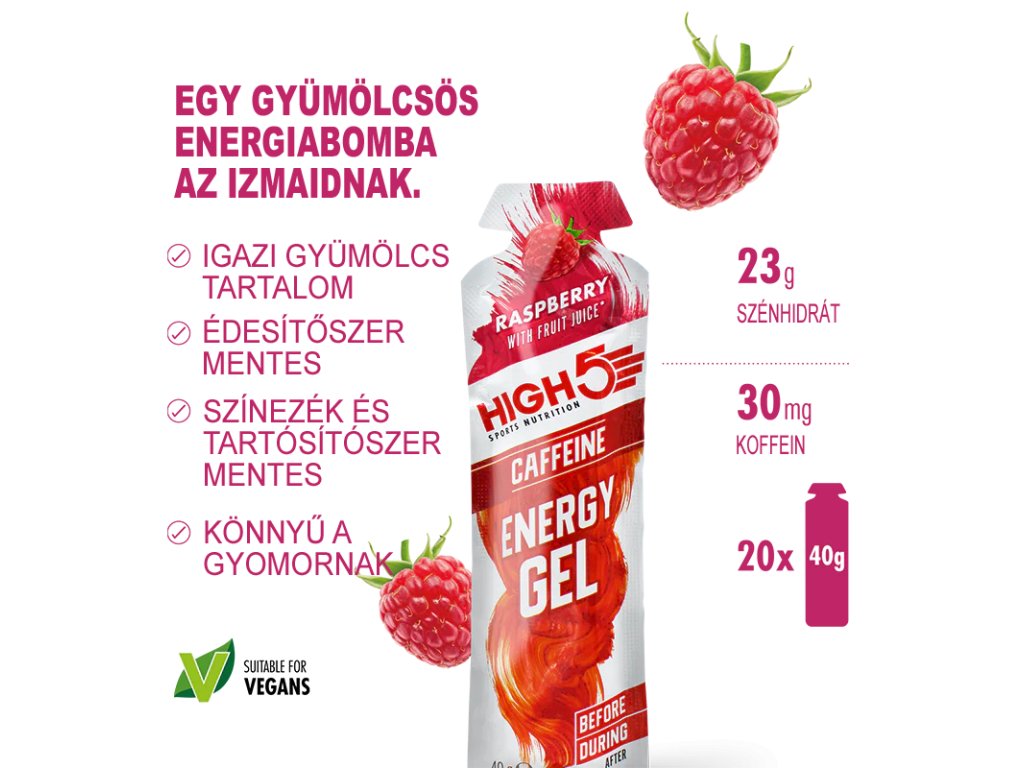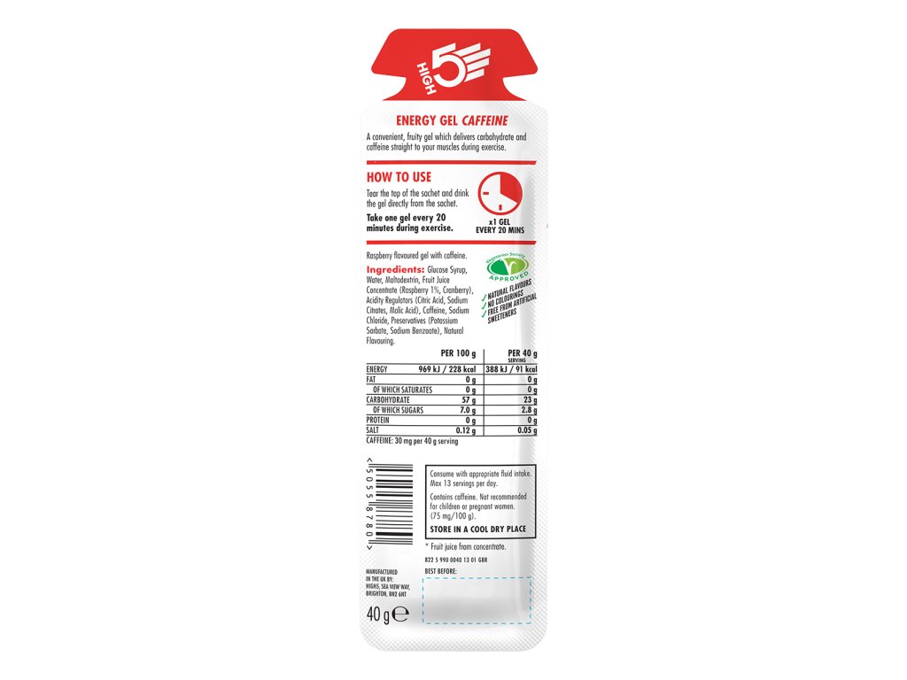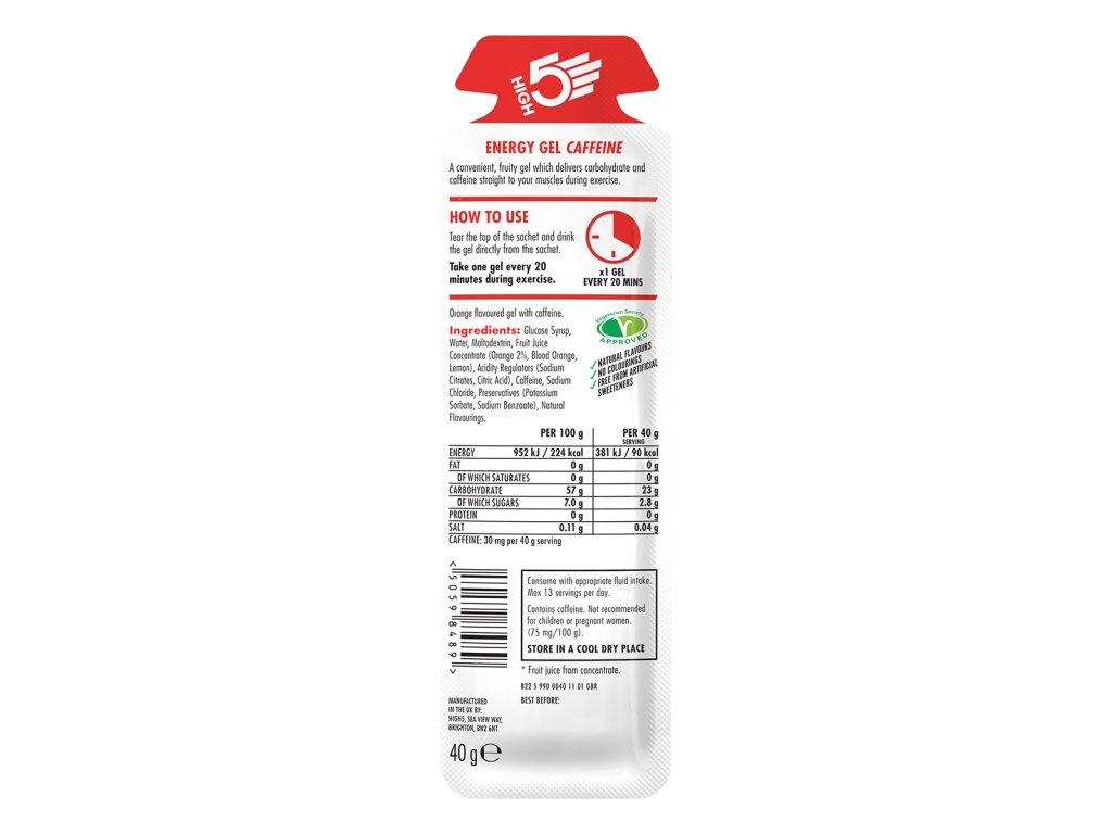 A High5 Energy Gel Caffeine egy negyedik generációs gél, hígabb állagú, mint a piacon kapható gélek többsége, ezért egyszerű használni. Az Energy Gel Caffeine nem túl édes, nem túl sűrű, így amikor ki vagy száradva, akkor is könnyű fogyasztani. Az Energy Gel Caffeine tartalmaz minden alapvető elektrolitet, hogy maximalizálja a folyadék és a szénhidrát-utánpótlást. A High5 Energy Gel Caffeine ideális energia-utánpótlás azok számára, akik tiszta, természetes forrású energiát szeretnének. Vegetáriánusok is fogyaszthatják, továbbá teljesen mentes bármilyen génmódosított tápanyagtól.