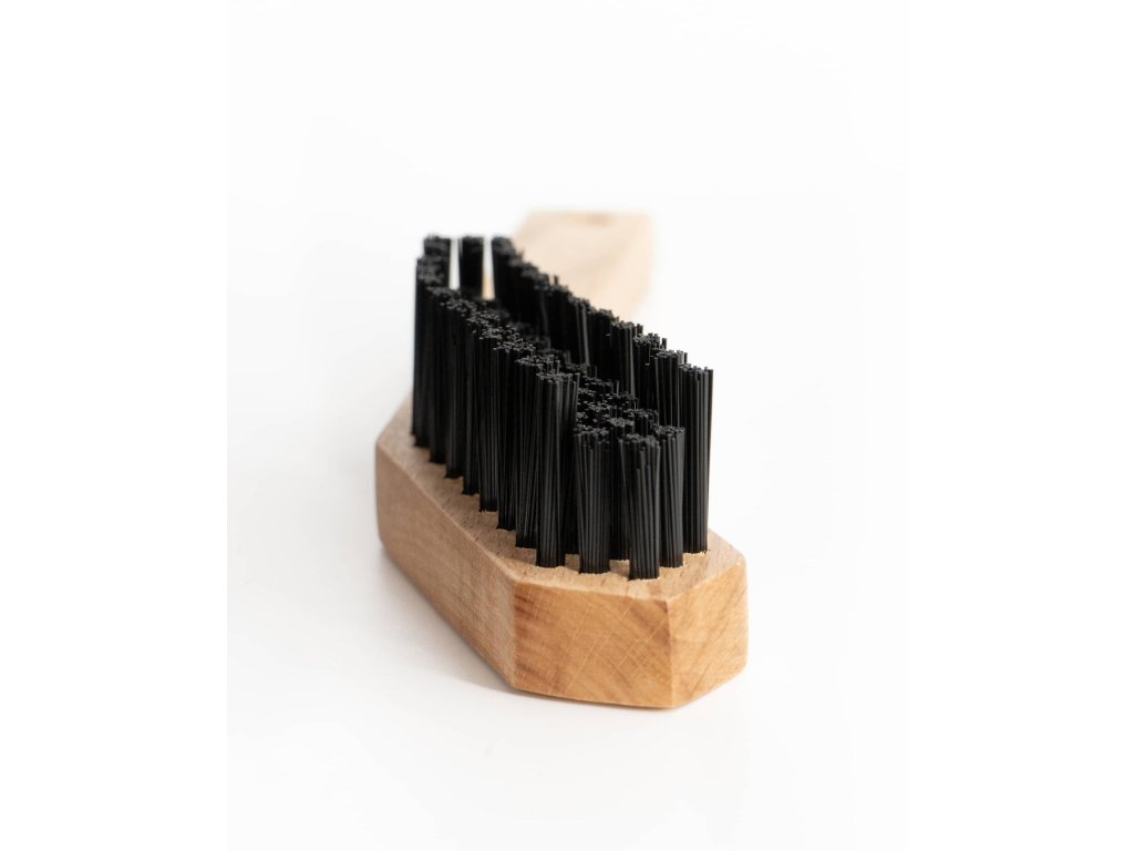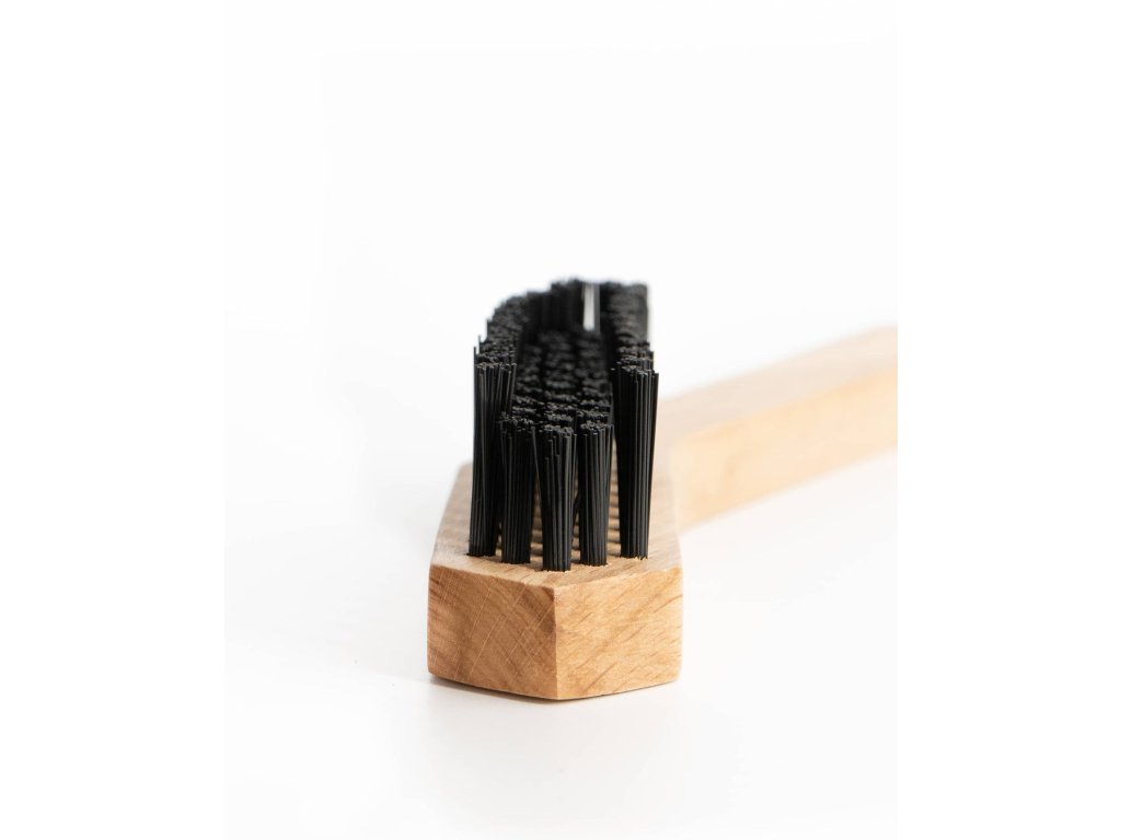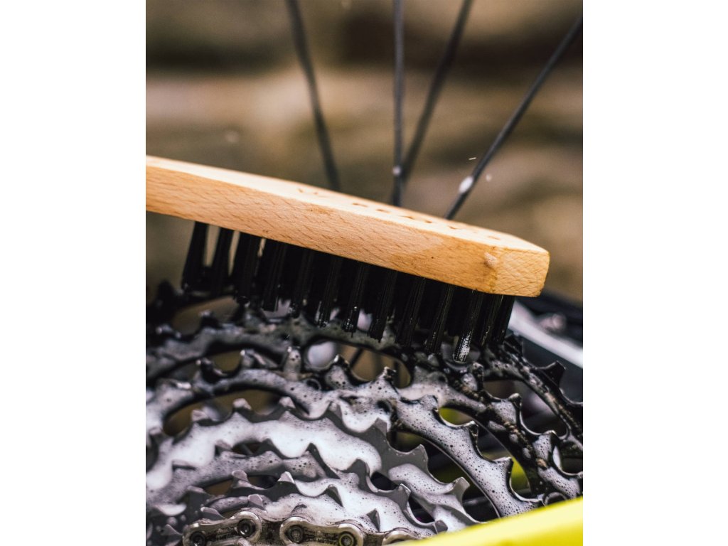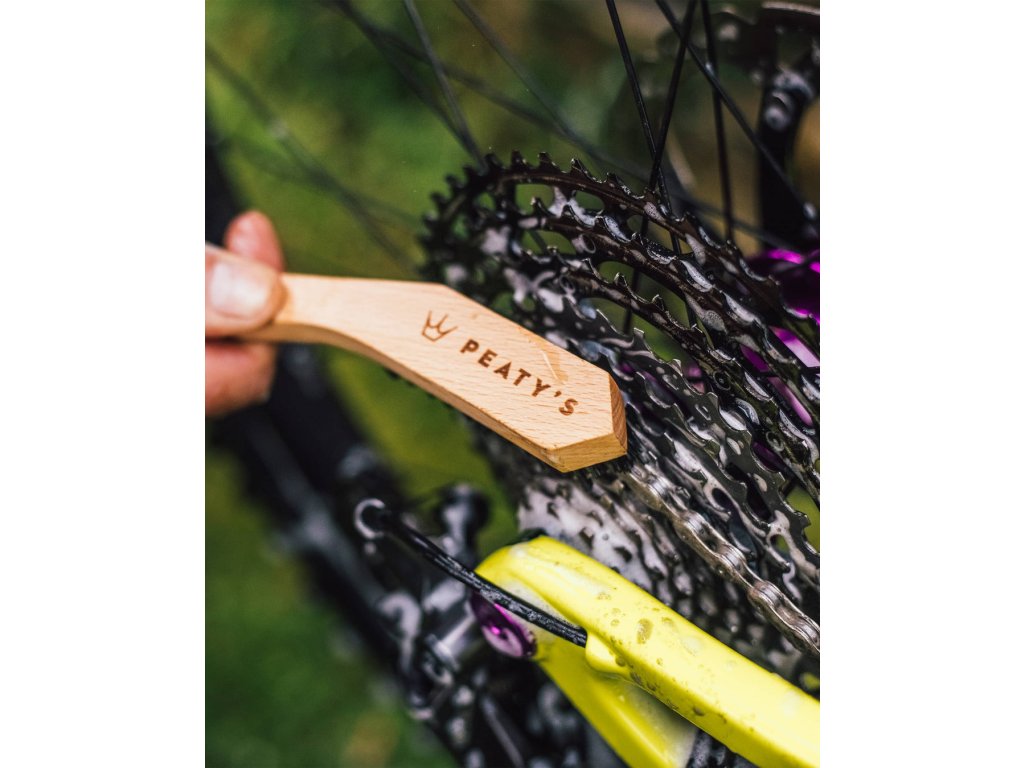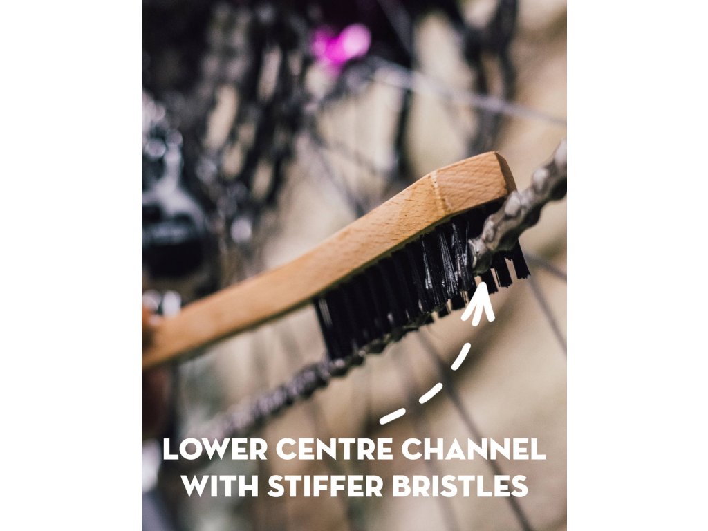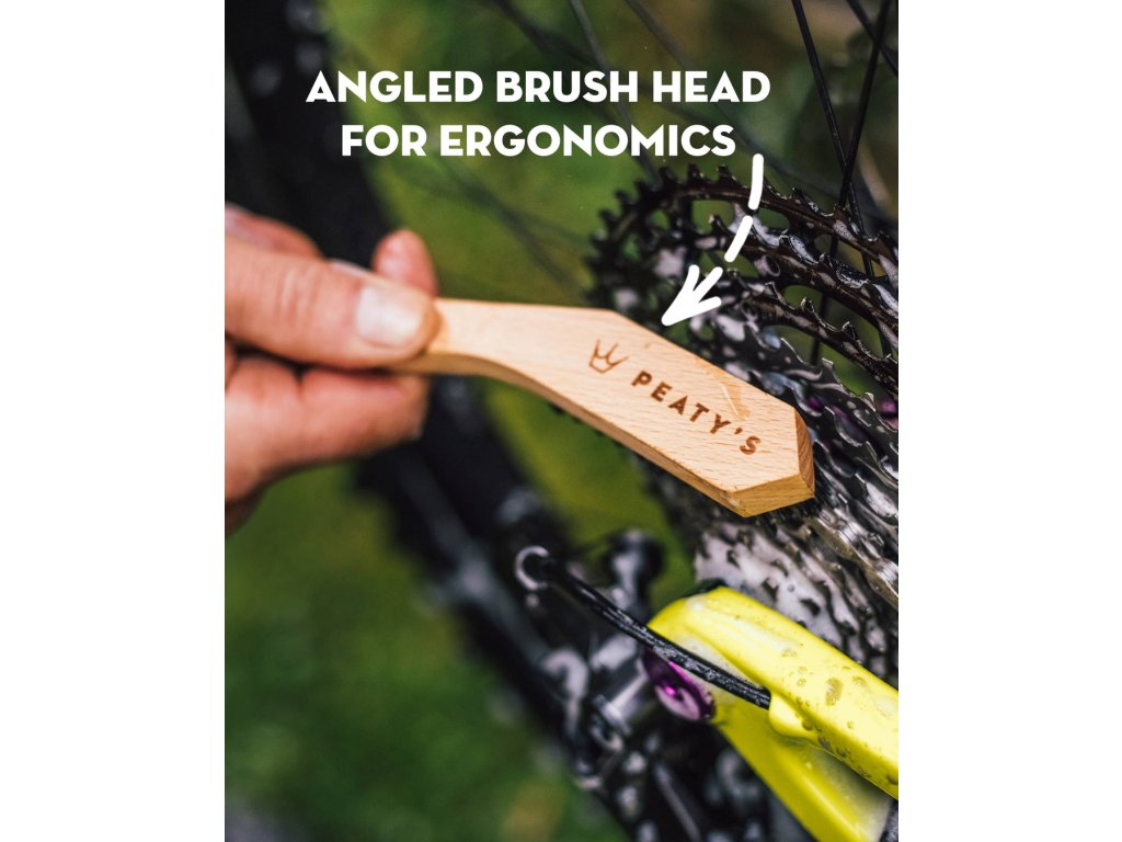 A Peaty's Drivetrain Brush merev, tartós sörtéi alacsony középső csatornával rendelkeznek, amelybe a lánc beleülhet. Ez merevebb sörtéket hoz létre a közepén a kemény súrolás érdekében, míg a vésős hegy segít lekaparni a lánc vezető kereket.